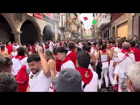 As there were lots of people dressed in white and red, we asked some young lads what was going on. Celebrating Saint Fermin - another bull run. The festival was starting at noon - but the bull run is tomorrow morning at 9am. One of the lads was doing it. Do you congratulate or commiserate?